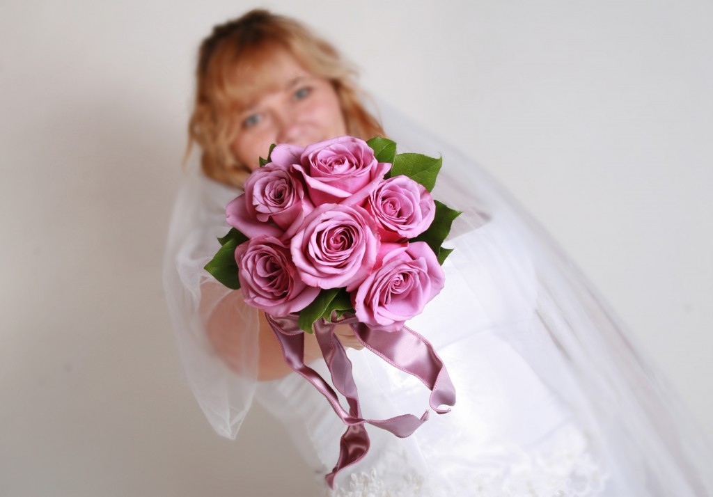beautiful bride and her bouquet of pink roses.