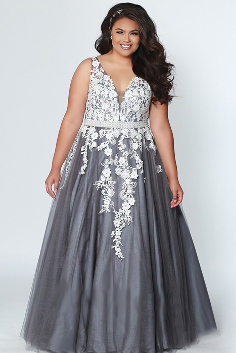 Beautiful floral detail, and wide, bra friendly straps make this plus size formal gown one of our favorites!