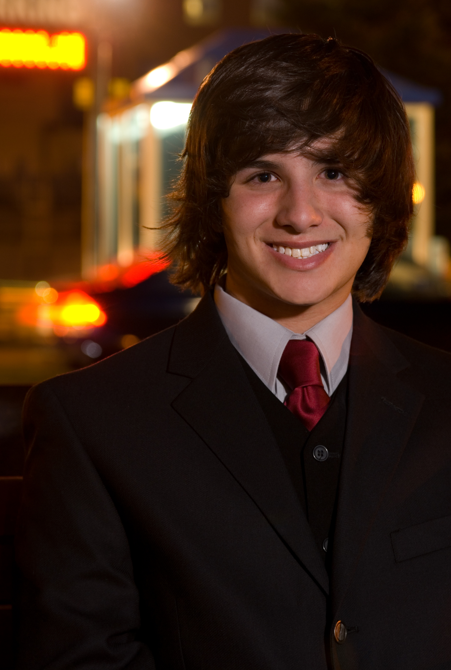 A teenage male in a suit near a parking garage, as if out on prom night
